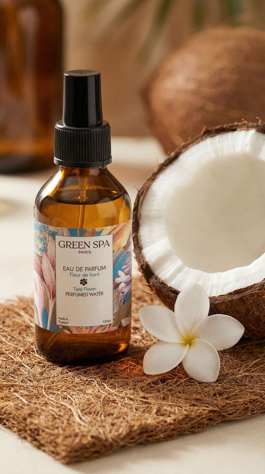 Douceur et envoûtement sont de la partie, avec l’Eau de Parfum naturelle à la Fleur de Tiaré. La Fleur de Tiaré, ce petit arbuste, nous vient des îles du Pacifique. Avec son puissant parfum de jasmin, elle embaume toutes les pièces et crée un univers de détente incomparable.