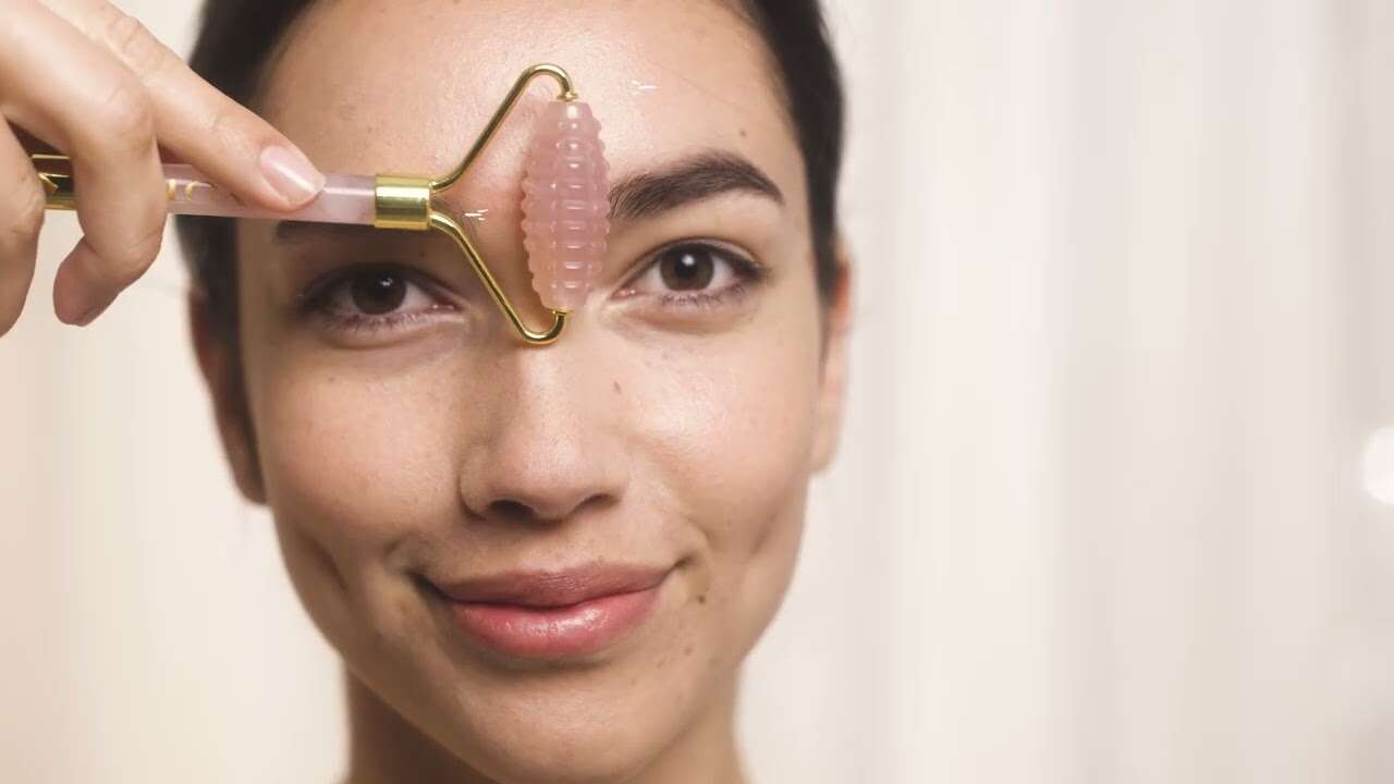 Soin liftant du visage effectué avec des rouleaux de quartz rose raffermissants